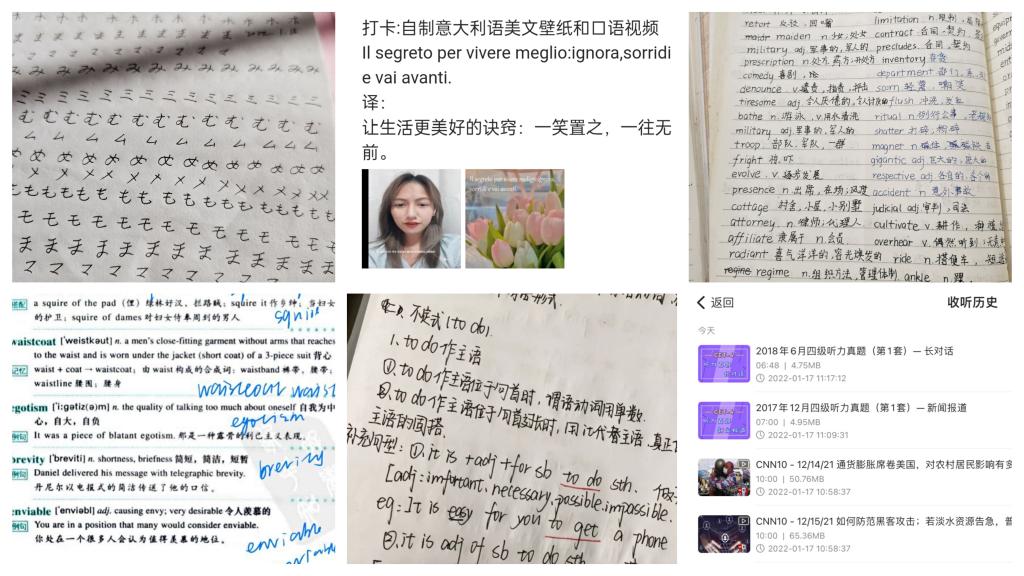 在本期“小伙伴计划”中,外语计划在开始之际即稳步进行,并于2月10日顺利结束。参与外语计划的“小伙伴”们通过各式各样的学习方法进行打卡,包括背单词、学语法、练口语等。活动过程中,“小伙伴”们因拥有相同的目标而结识,并自主结成伙伴进行外语的学习与探讨,部分“小伙伴”在活动开始前就已养成自觉学习外语的好习惯,在过年期间仍会抽出一定时间进行外语学习和巩固,表现出了对外语学习的极大热情。