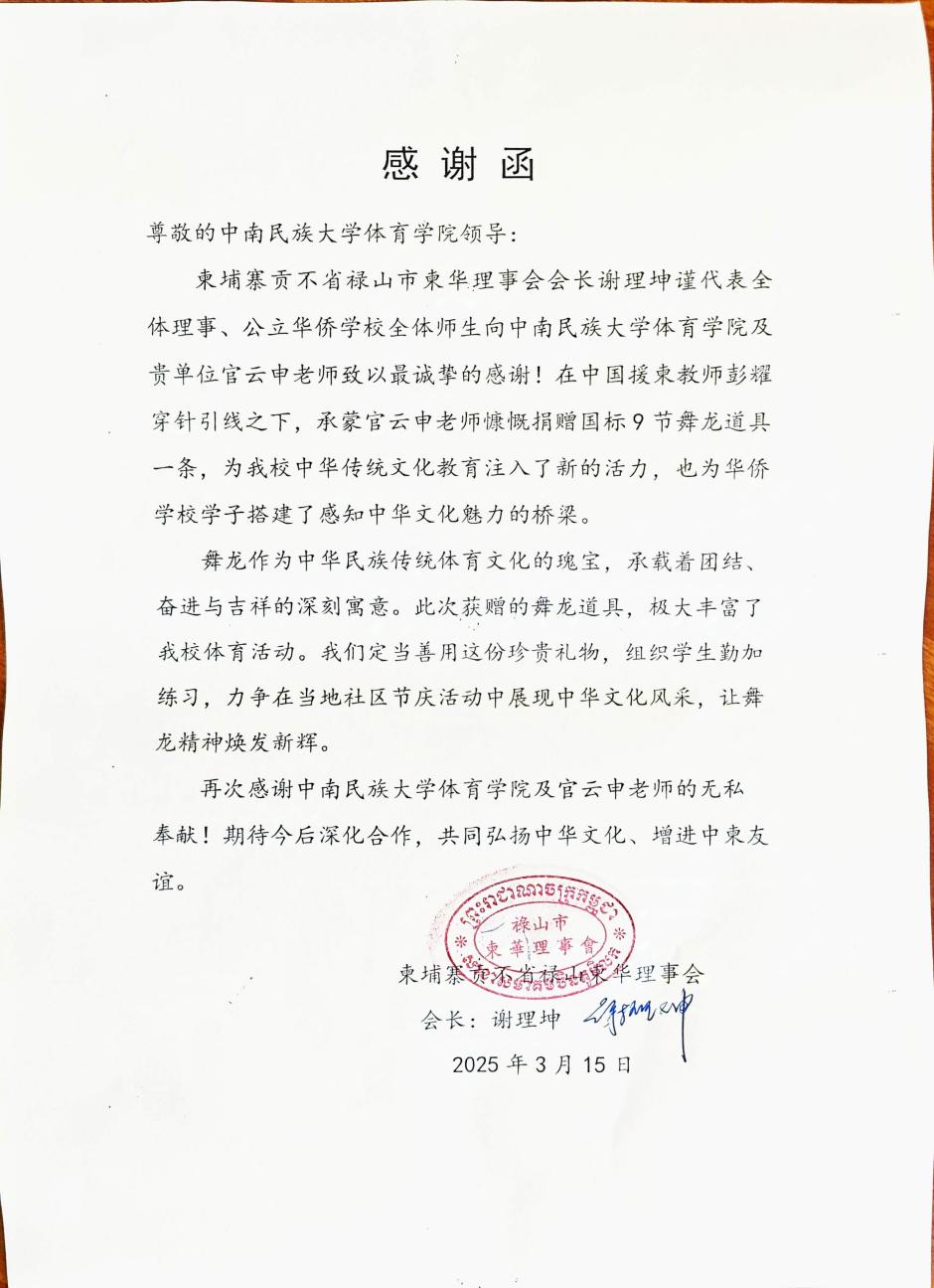 3月15日,我校体育学院收到了柬埔寨贡不省禄山市柬华理事会感谢函,谢理坤会长代表理事会和公立华侨学校感谢我校龙狮队指导老师官云申向柬埔寨公立华侨学校捐赠舞龙道具一套。这次捐赠不仅为海外华裔青少年搭建了感知中华文明的实践平台,更以传统体育为载体,续写着中柬友谊的新篇章。