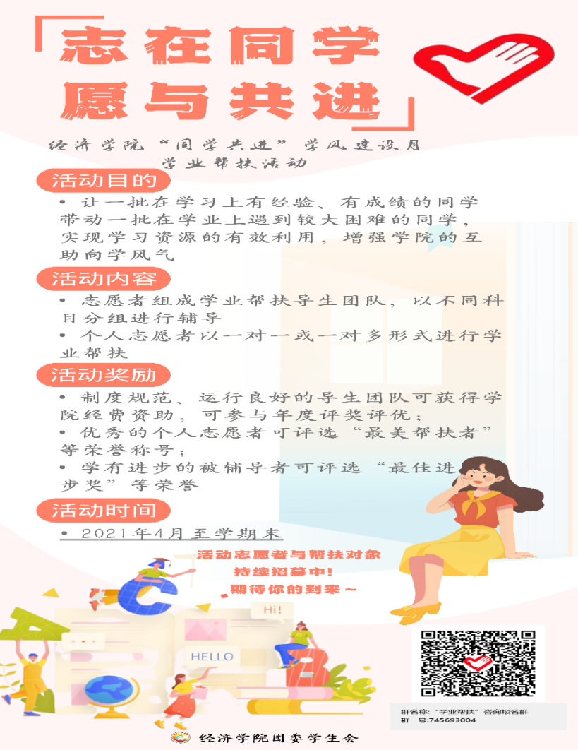 为形成勤学、好学、乐学的学习氛围,经济学院启动了以“同学共进”为主题的学风建设活动。学院统筹规划、多措并举,通过分类指导、朋辈引导、宣传倡导等方式有针对性地帮助学生制定学业规划,解决学业困难,开展学业帮扶。