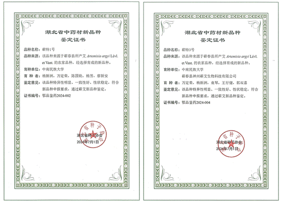 近日,中南民族大学作为育种单位,本校药学院万定荣、杨新洲教授作为育种者,在多年研究基础上,分别牵头选育的两个蕲艾新品种“蕲特1号”和“蕲特3号”,均获得湖北省中药材新品种鉴定证书。