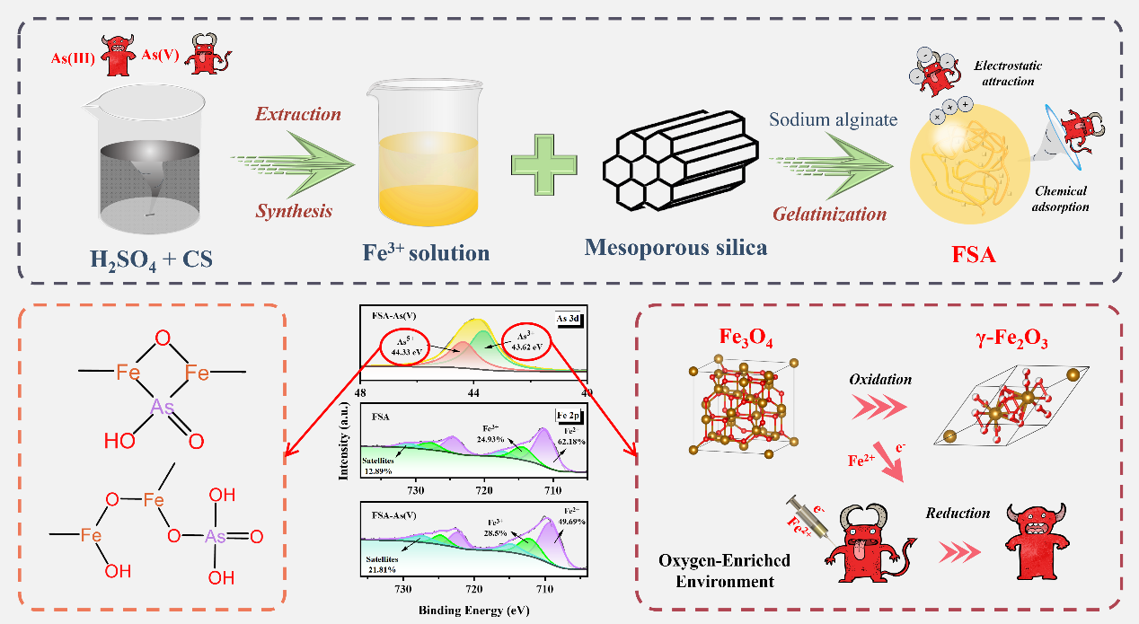 为响应国家号召,该研究以工业固体废弃物——铜渣(cs)为基体材料,利用“分步提取-模板合成法”制备出铁氧化物和介孔二氧化硅(msio2),并引入富含羟基与羧基的海藻酸钠进行交联,合成了对as(v)具有良好吸附性能的微球吸附剂:fe-msio2/sa(fsa)(φ=2–3 mm)。所制备的msio2具有高度有序的六方介孔结构,负载的铁均匀分散在msio2上,并以α-feooh和β-feooh的形式存在。研究还发现了在富氧条件下,fe3o4被氧化成γ-fe2o3,吸附的as(v)与fe2 发生电子迁移还原成as(iii),形成稳定的单齿络合结构固定在fsa表面。同时,这些微球的独特球体结构克服了传统粉末吸附剂在固液分离方面的不便和高成本问题。